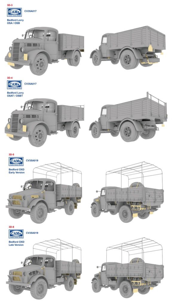 Los camiones de las series K, M y O de 1939 se rediseñaron rápidamente para su uso militar. Se trataba en gran medida de una cuestión de estilo, que incluía un capó inclinado con un frontal plano con faros incorporados y una barra de choque para proteger el radiador en caso de colisión menor. Las versiones militares se denominaron series OX y OY, y de nuevo se destinaron a una amplia gama de tareas, incluidos comedores móviles, camiones cisterna, camiones de uso general y una versión con semirremolque Tasker utilizada por la Royal Air Force para transportar aviones desmantelados o dañados. Esta variante era conocida popularmente como Queen Mary. Varios chasis Bedford OXD de 1,5 toneladas se transformaron para fabricar el vehículo blindado Bedford OXA. En total se construyeron 72.385 camiones OY y 24.429 OX. El Armadillo era un OY equipado para la defensa de aeródromos con cañones Lewis y COW de 37 mm.