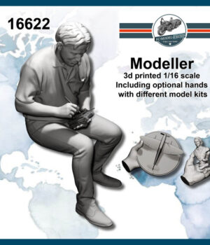 La marca FC Modeller Trend (ESP) ofrece este kit en resina e impresión 3D que representa un modelista en acción, escala 1/16, el modelo incluye varias posturas de manos y diferentes kit en ejecución. FCModeltrend crea accesorios para maquetas a escala 1/16 1/24 1/35 1/48 y 1/72 para utilizar con modelos Sherman, Tiger, Panther, Spitfire, Messerschmitt, Mig, etc. Sus productos impresos en 3d y calcas pueden usarse en maquetas de marcas como Tamiya, AFV club, Meng, Trumpeter, Hobby boss, Revell, Takom, Hasegawa, Dragon, ICM, Miniart, AMMO entre otros.