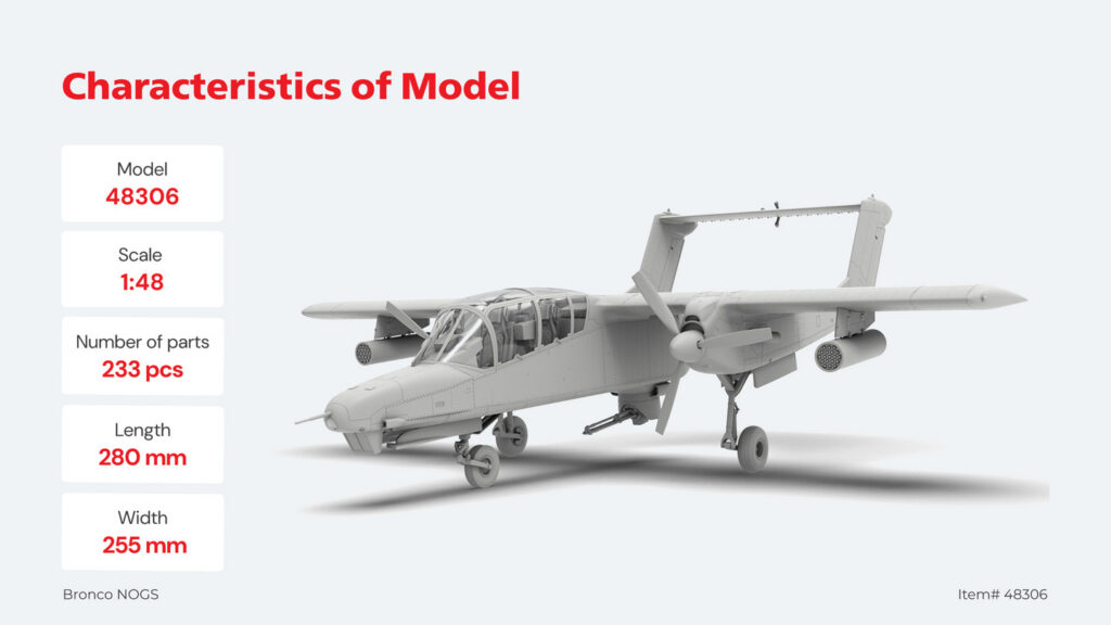 ICM models (UKR) presenta su kit de plástico inyectado en escala 1/48 del Bronco NOGS (Night Observation Gun System) de North American Rockwell, el kit cuenta con 233 piezas, moldes nuevos y con calcas para 5 versiones distintas. Esta versión corresponde a una modificación realizada en 1970 para dotar de dientes a la plataforma de observación para operaciones nocturnas. Operaban solos o en compañía de OV-10A.