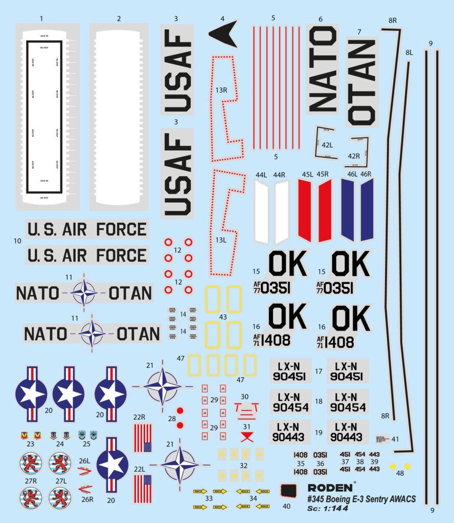 La marca Roden (UKR) ha liberado su nuevo kit dedicado al Boeing E-3 Sentry AWACS en escala 1/144, kit de plástico inyectado. El primer avión Boeing E-3 Sentry AWACS, desarrollado por Boeing a partir del avión de pasajeros Boeing 707, se entregó en marzo de 1977. El avión estadounidense AWACS de alerta temprana y control proporciona vigilancia, mando, control y comunicaciones en todas las condiciones meteorológicas y es utilizado por la Fuerza Aérea de los Estados Unidos, la OTAN, las Fuerzas Aéreas y Espaciales Francesas, la Real Fuerza Aérea de Arabia Saudita y la Fuerza Aérea de Chile. El E-3 tiene una distintiva cúpula giratoria de radar (rotodomo) sobre el fuselaje. La producción cesó en 1992, tras fabricarse 68 aviones.