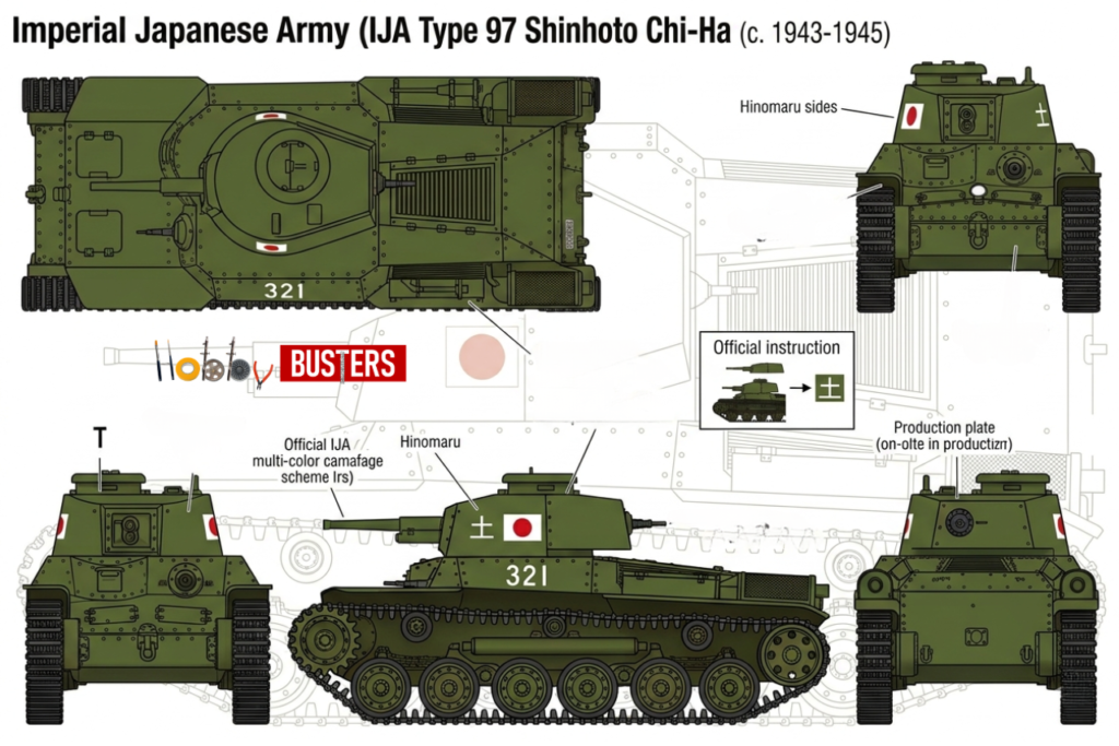 Esta imagen es un perfil técnico completo de un Type 97 Shinhoto Chi-Ha en su configuración de guerra tardía (c. 1943-1945). Muestra la evolución del camuflaje del IJA hacia un esquema de verde follaje sólido, más simple, que reemplazó al anterior patrón multi-color.