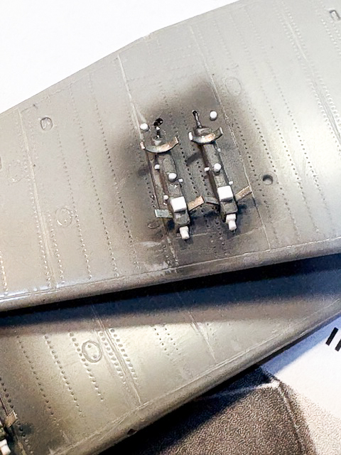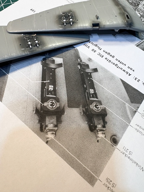 Agregando algunos detalles en los 4 racks para las bombas de 50kgs, decidí esa configuración ´por sobre los estanques de combustible. Como conseguí harta información gráfica publicaré al final los pdf recolectados.
